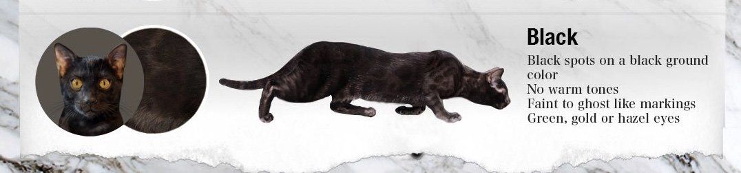 Este sin duda, es el menos común de todos. Su manto es completamente negro, extremadamente brillante y sedoso. Sus rosetas también son negras, por lo que resulta difícil verlas a simple vista, dependerá mucho de como incida la luz. El contraste en este color es mínimo. Sus ojos suelen ser verdes o marrones intensos. Es una mini pantera.