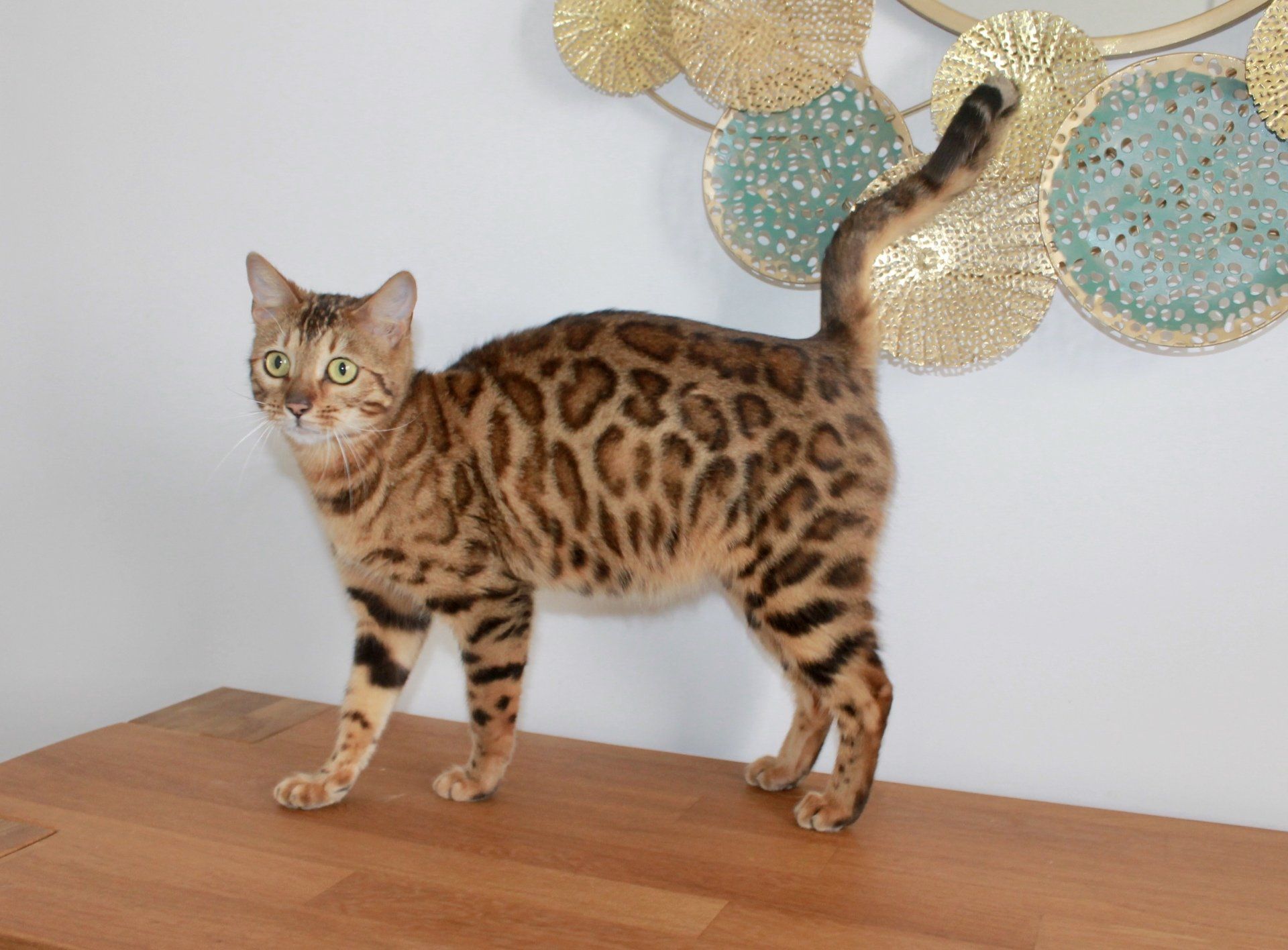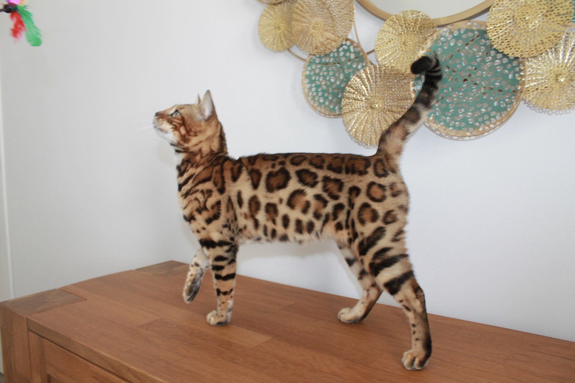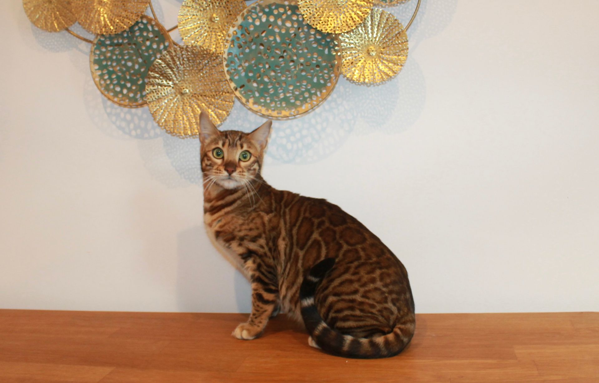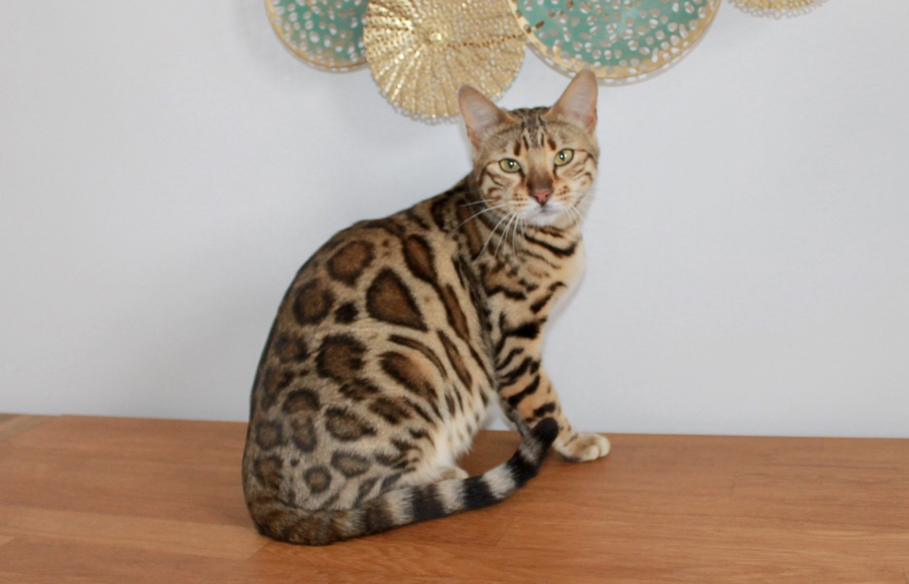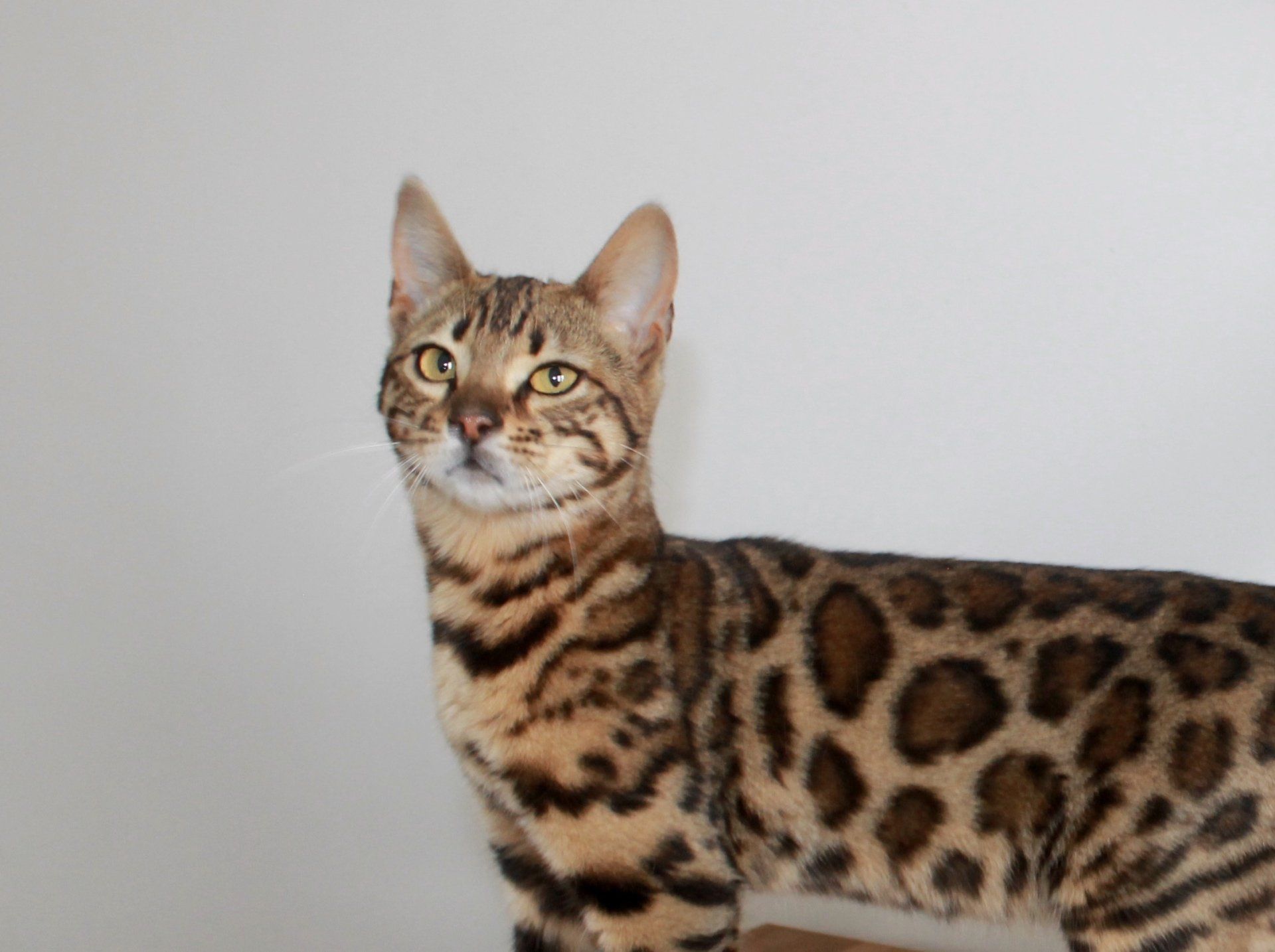 Gimli es puro amor, es un gatito extremadamente cariñoso y juguetón. Sus rosetas son grandes, redondas y muy llamativas. El fondo del manto es muy claro, y el perfilado de roseta muy negro, y el interior de roseta es color caoba intenso. Su cabeza tampoco pasa desapercibida, tiene un mentón muy pronunciado, un perfil recto, unas orejas de mediano tamaño y unos ojos grandes y color verde intenso. Estamos seguros que nos dará muchísimas alegría y aportara unos bebés preciosos, con colores muy intensos como los suyos.