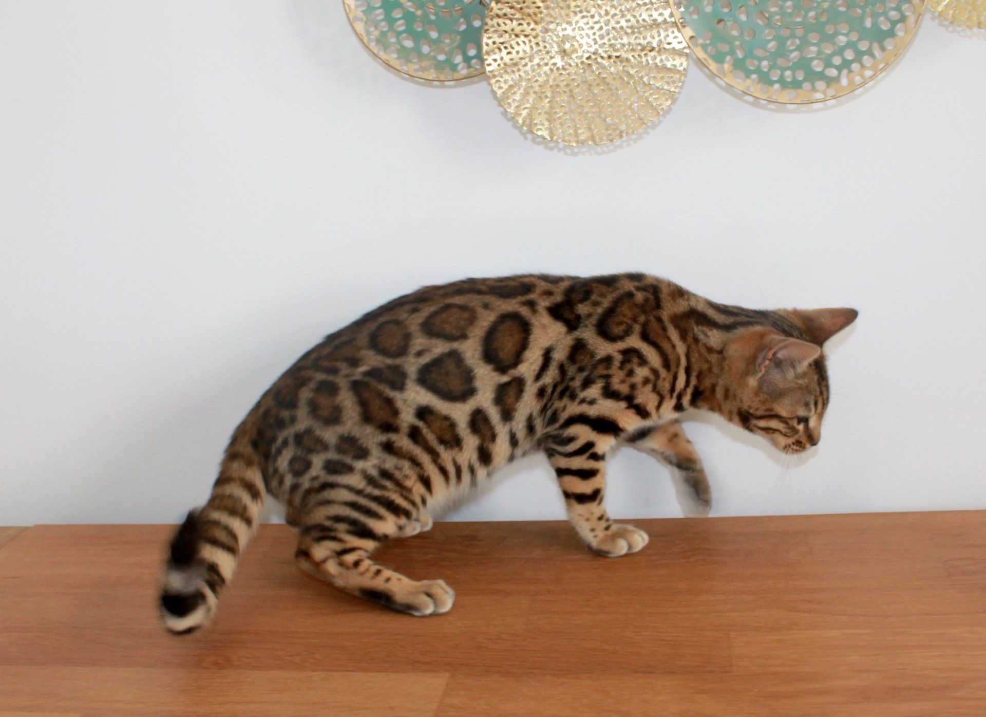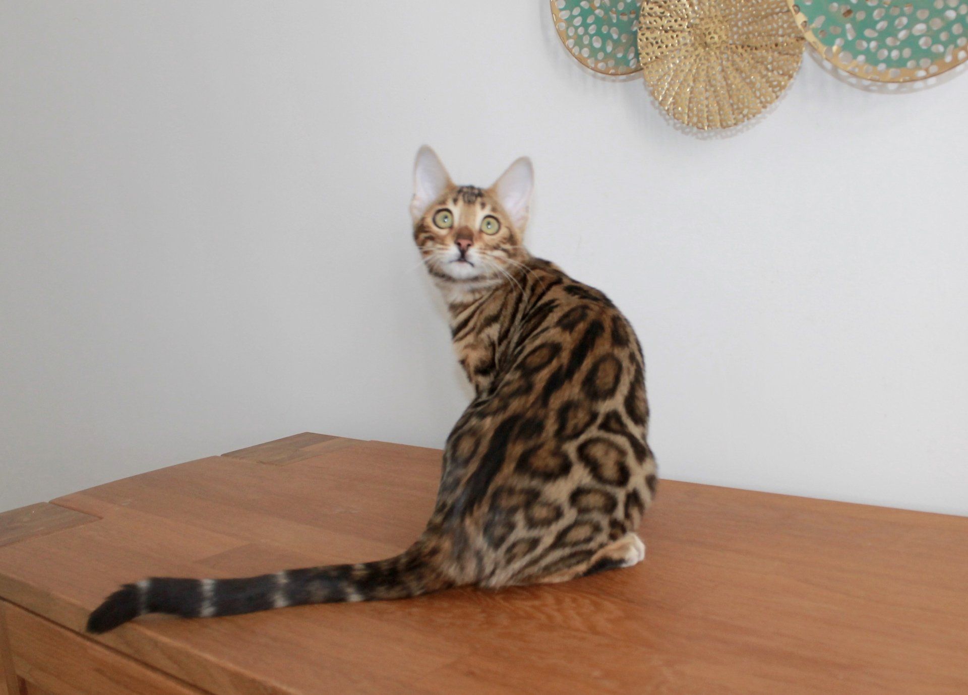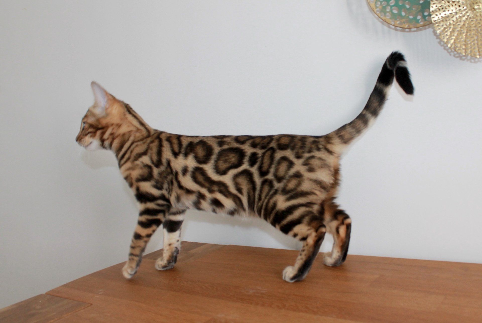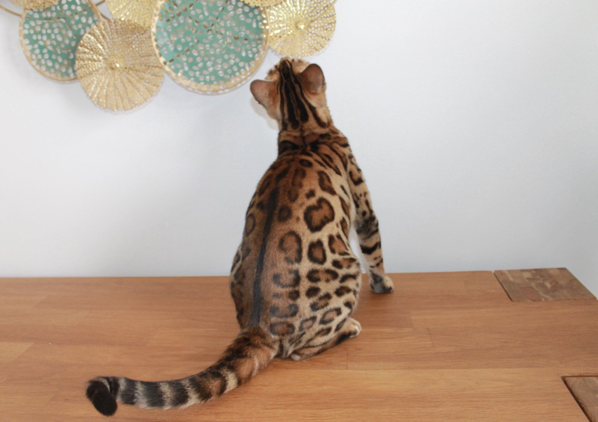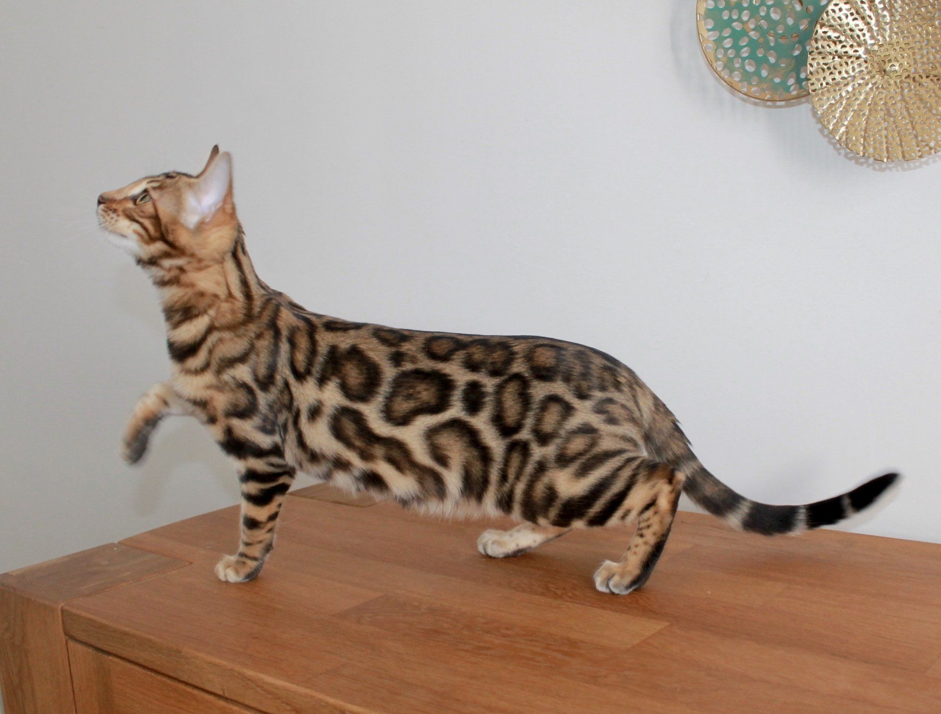 Gimli es puro amor, es un gatito extremadamente cariñoso y juguetón. Sus rosetas son grandes, redondas y muy llamativas. El fondo del manto es muy claro, y el perfilado de roseta muy negro, y el interior de roseta es color caoba intenso. Su cabeza tampoco pasa desapercibida, tiene un mentón muy pronunciado, un perfil recto, unas orejas de mediano tamaño y unos ojos grandes y color verde intenso. Estamos seguros que nos dará muchísimas alegría y aportara unos bebés preciosos, con colores muy intensos como los suyos.