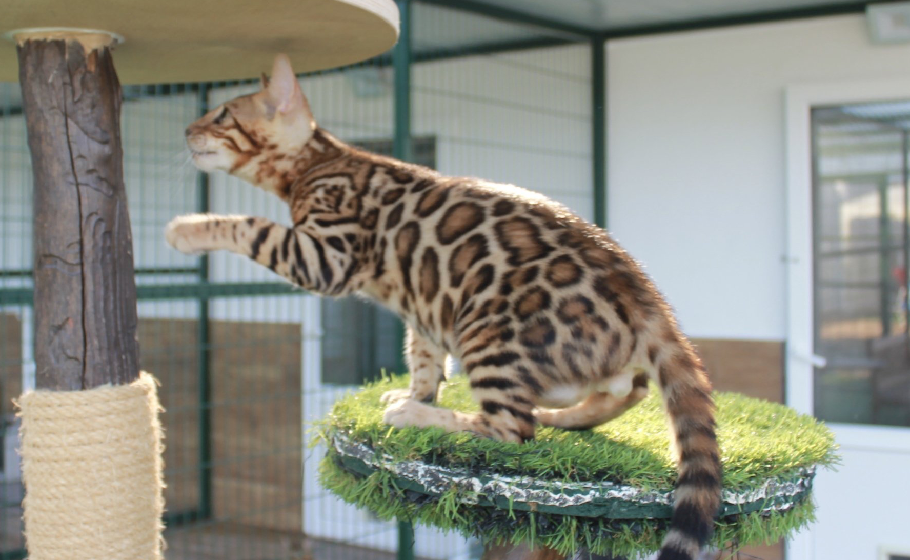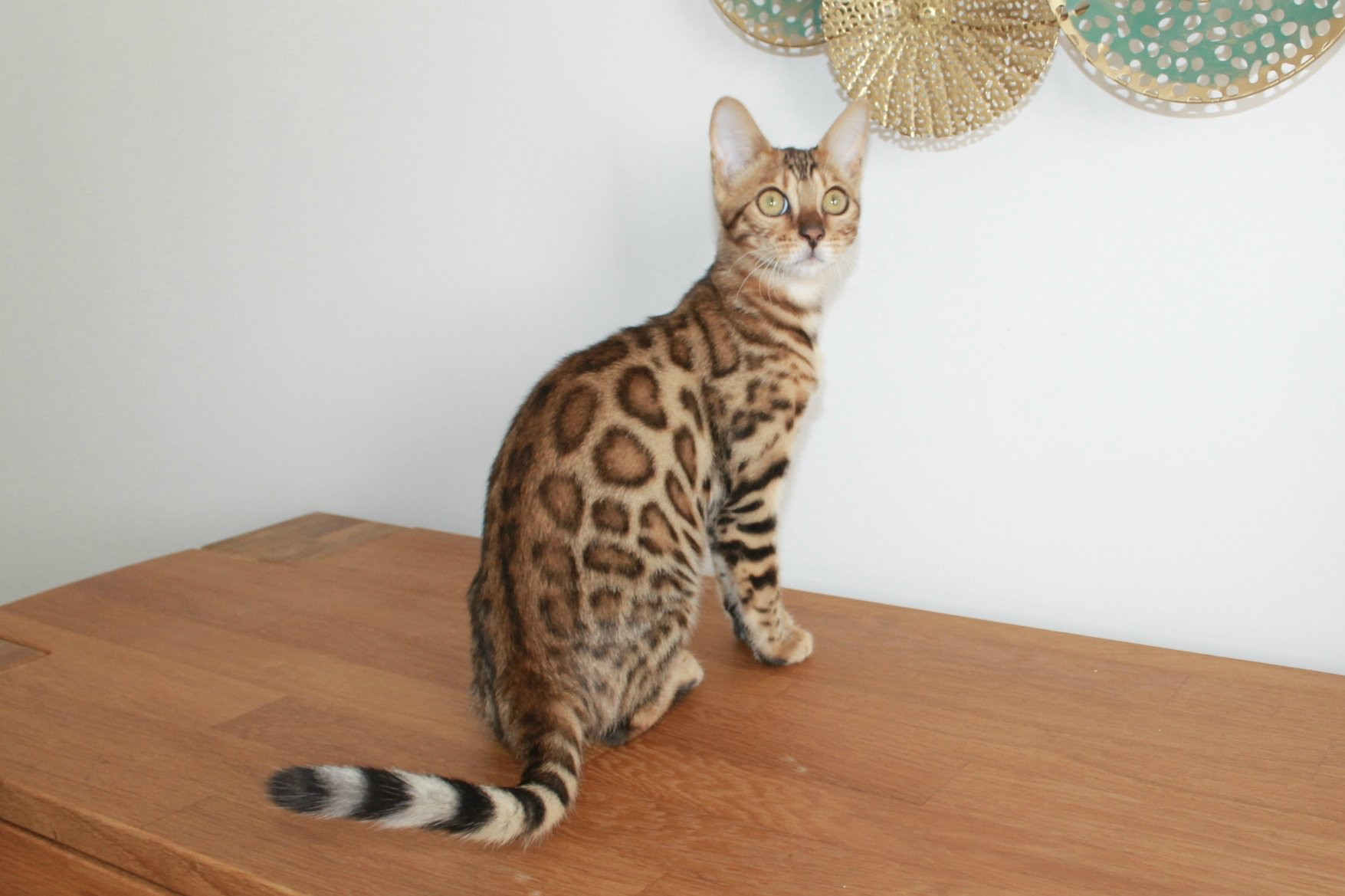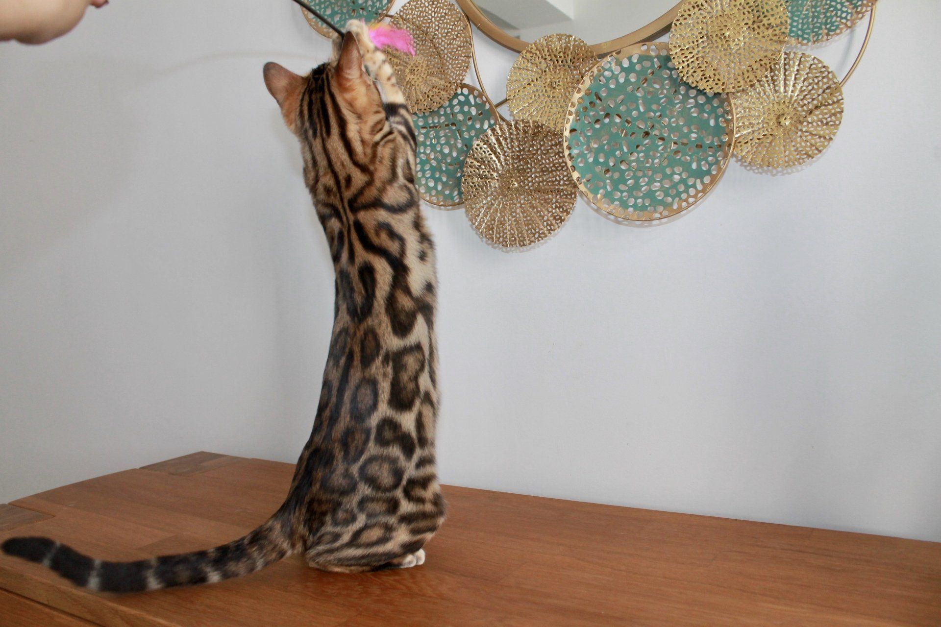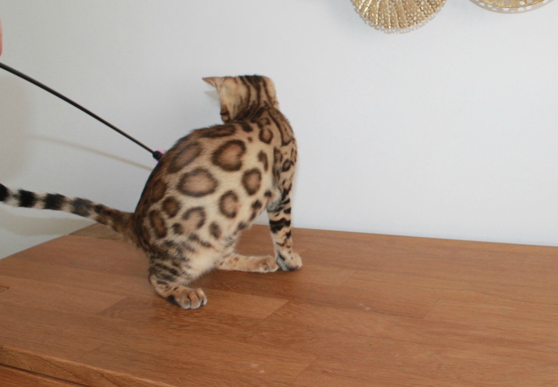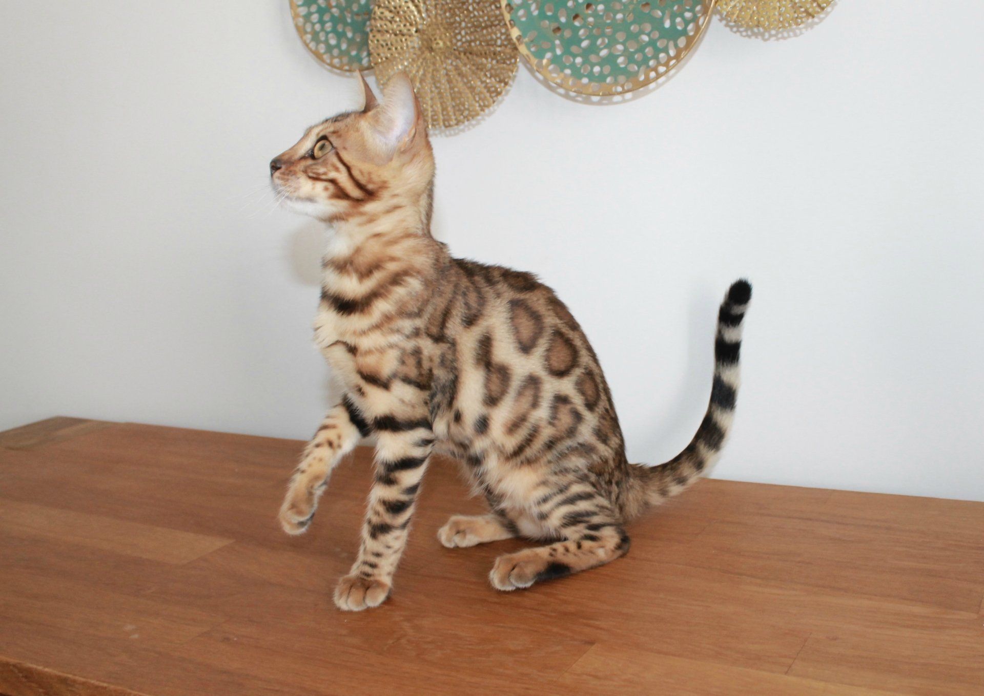 Estamos muy contentos de tener en nuestras manos a Sunny. Es una gata increíble, con un color súper intenso, rosetas redondas, regulares, bien posicionadas, separadas, sin linea vertical y con una calidad de pelo increíble. También tiene una cabeza muy correcta, con un mentón pronunciado y con unos grandes ojos amarillos, que le hace tener una mirada súper felina. Su cola es gruesa y corta, una característica poco común. Y de carácter es super movida, juguetona y traviesa. Queremos dar las gracias a nuestra amiga Ruth de Oasian Bengal, por cedernos y confiarnos a esta maravilla de bengal.