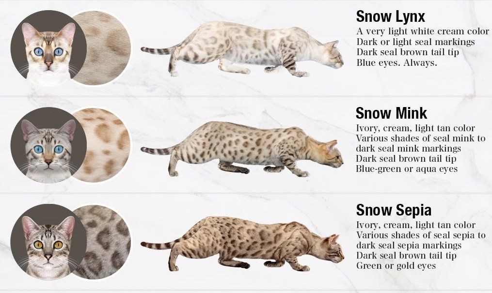 Dentro de los Bengalí Snow, hay 3 tipos diferentes: Snow Lynx, Snow Mink y Snow Sepia.